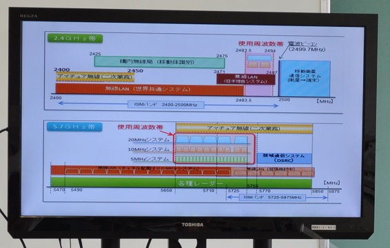 新たに追加された「②二次業務に使用する周波数」については、2.4/5.6GHz帯の一時業務の使用区分図を用いて説明。